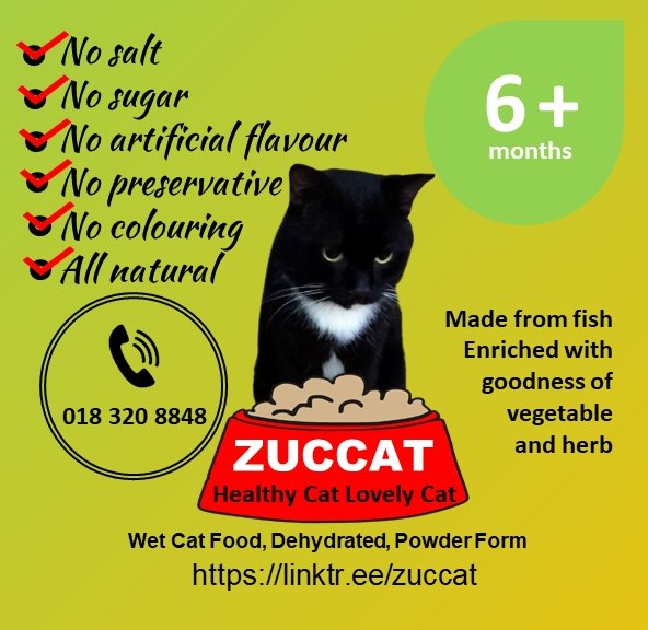 Kini kita tak perlu lagi bersusah payah untuk sediakan makanan rendah garam / tanpa garam untuk kucing peliharaan kita, kita boleh je beli Zuccat.
