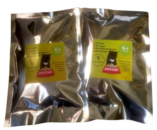 Zuccat didatangkan dalam bekas yang mengandungi 10 paket dengan setiap paket sesuai untuk satu hidangan. Zuccat – wet cat food, dehydrated, in powder form.